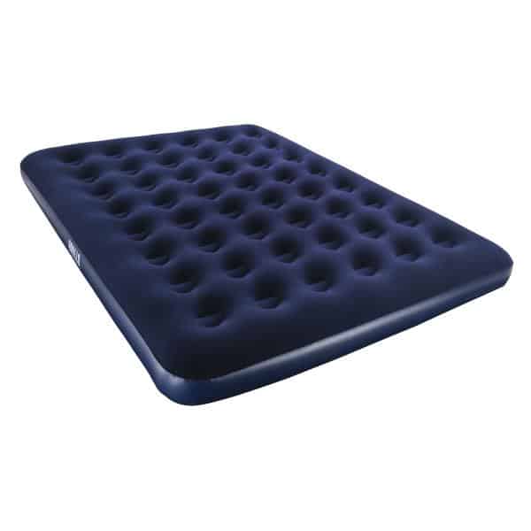 Den blå luftmadras har en velouroverflade, som gør den blød at ligge på.